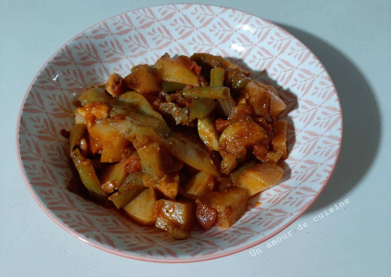 - Chauffez l'huile dans une marmite ensuite incorporez les légumes suivant, oignon, ail, pomme de terre, poivron, tomate fraîche, l'assaisonnement, 1/2 verre d'eau, portez à ébullition ensuite baissez le feu et cuire à couvert.
