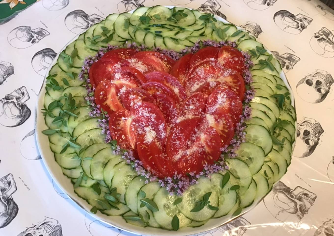 - Ajouter les tranches de concombre autour des tomates en superposant les tranches ajouter les fleurs de basilic autour du cœur de tomates