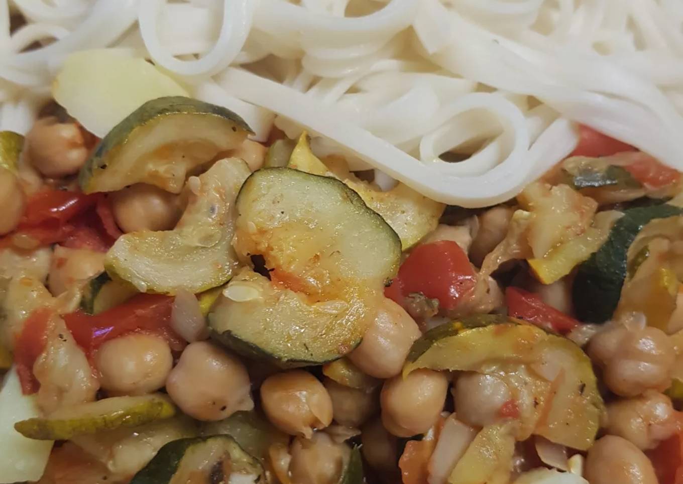 - Faire rissoler les oignons ou échalotes avec les rondelles de courgettes, puis ajouter les épices et les tomates coupé en morceaux et en fin de cuisson la boîte de pois chiche égouttée